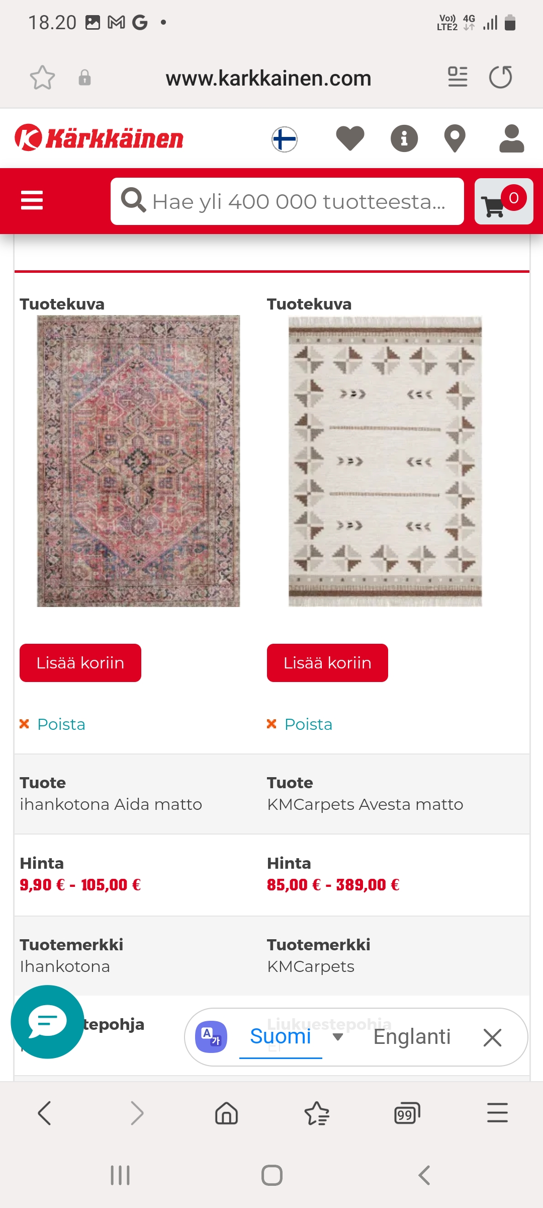 I watched some carpets in the internet shop www.karkkainen.com ("kärkäs"/"kärkkäästi"= (being) eager to grasp things quickly, "nenä"= nose), but I have no experience of the shop.